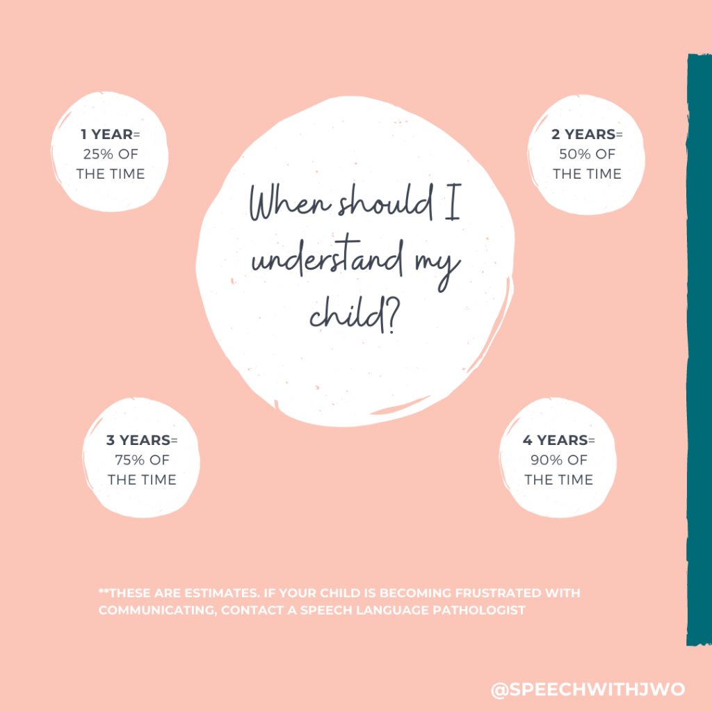 As a general rule of thumb, you should be able to understand your toddler 25% of the time between 1-2 years, 50% of the time between 2-3 years, 75% of the time from 3-4 years, and almost all the time after 4 years of age.